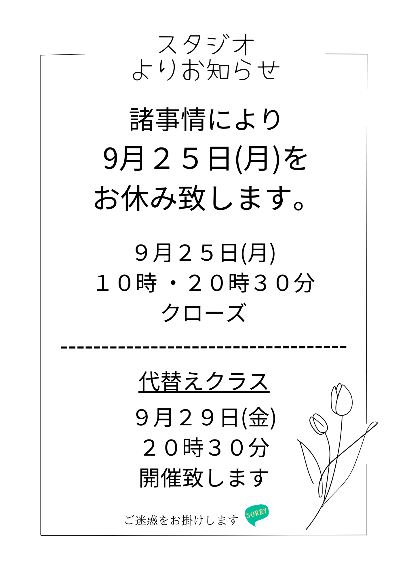 9月25日(月)諸事情により休館となります。代替えクラス(ビクラムヨガクラス)を9月29日(金)20:30に行います。